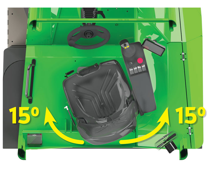Operator comfort and visibility were central to the design, with a spacious gas strut suspension cab and floor-to-ceiling glazing to enhance sightlines and reduce fatigue. A standout feature is the Auto Swivel Seat, which automatically turns 15 degrees left or right depending on the direction of travel, helping operators maintain a more natural posture through long shifts and repetitive manoeuvres.